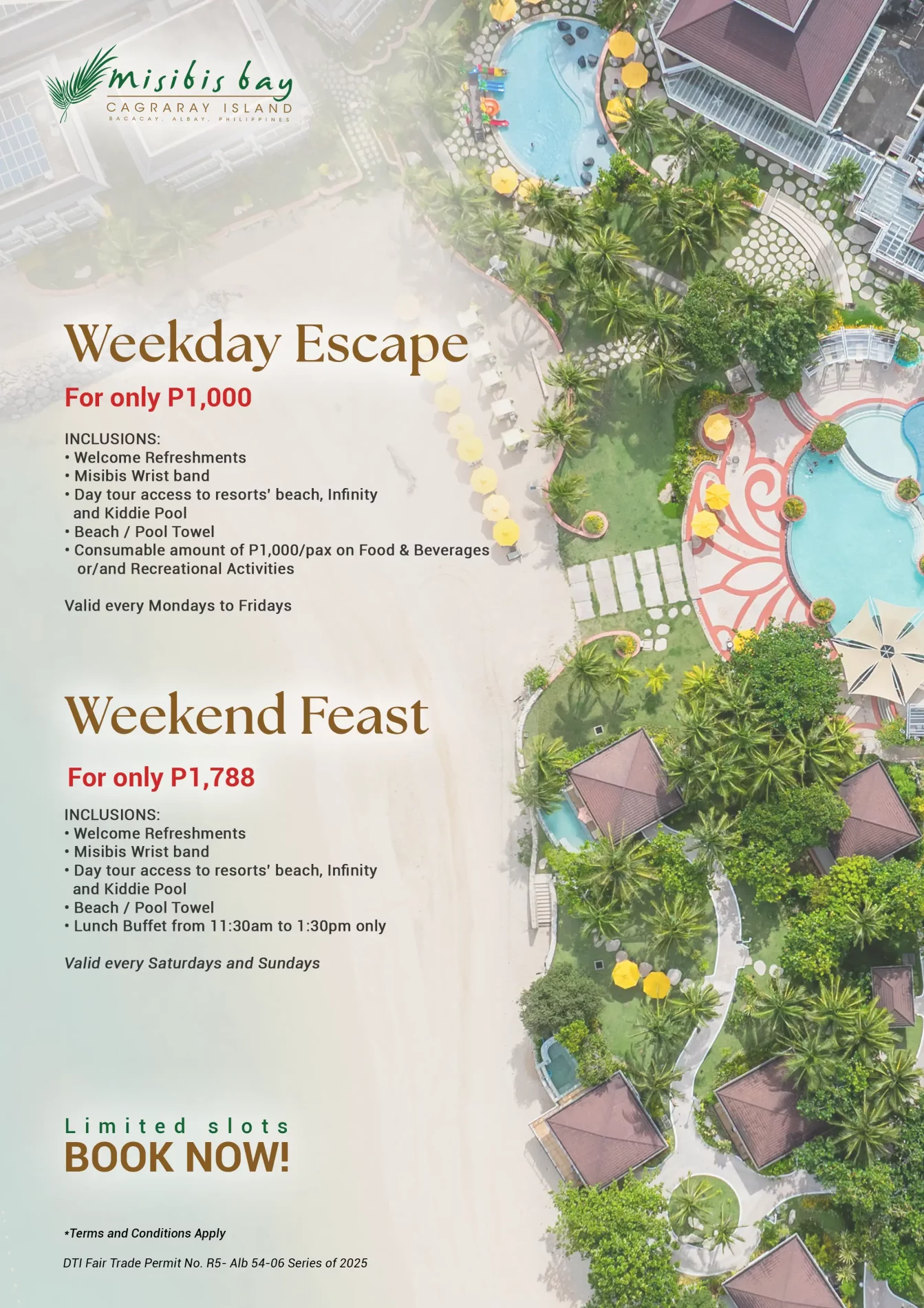 • Day tour access to resorts’ beach, Infinity and Kiddie Pool