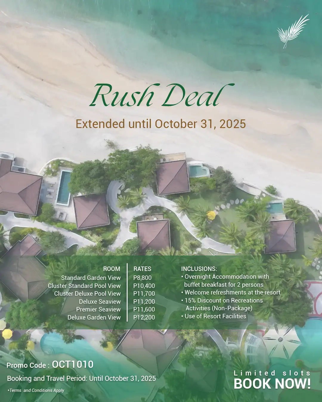 - All our available promos and packages for accommodation are below. Don't forget to click their TERMS & ROOM RATES button to see room rates, package inclusions and terms & conditions.